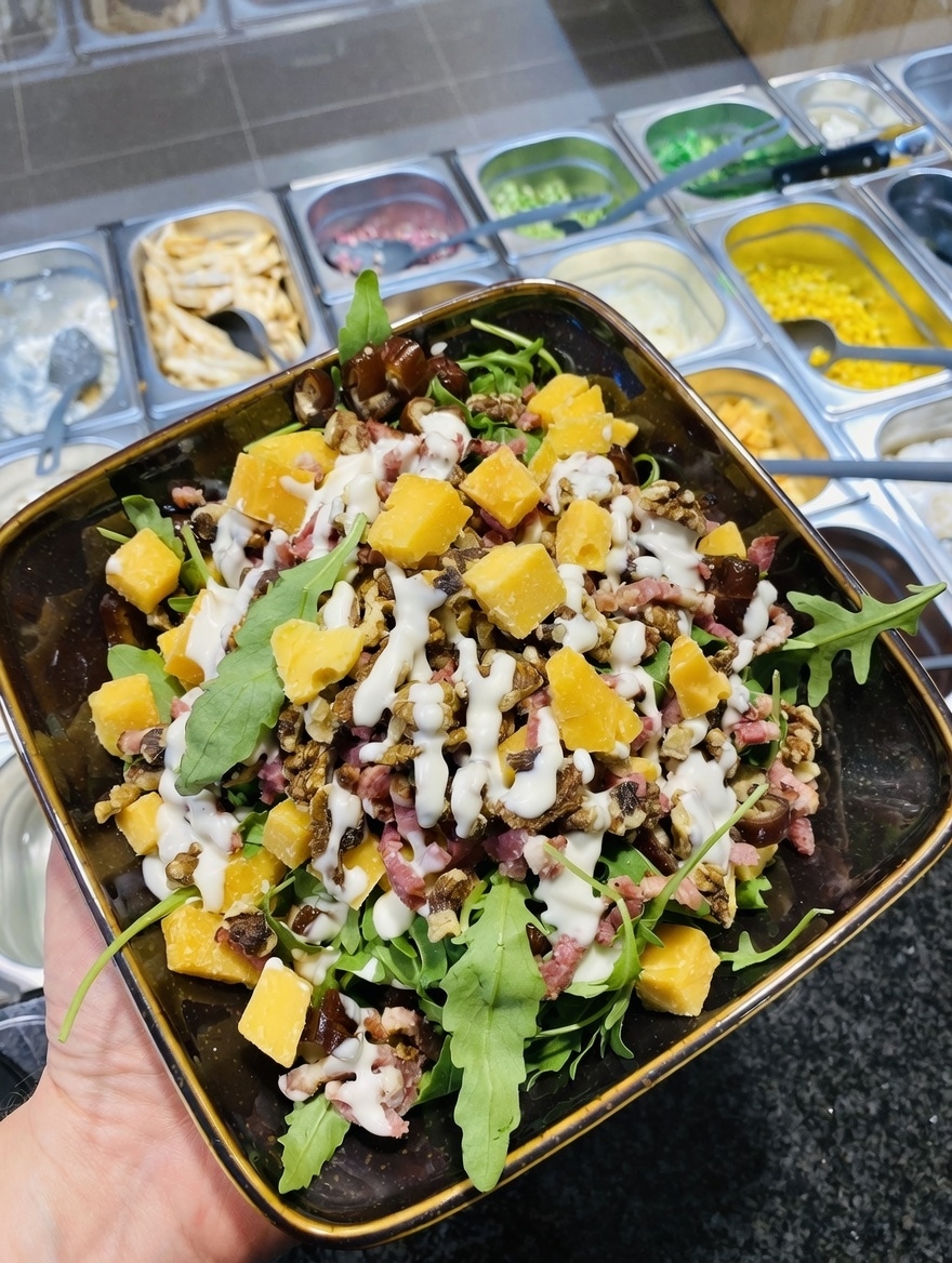 Brokkelkaas saladeQuinoa, Gemengde sla, Dadels, Appel, Spekjes, Flandrien grand cru, Honing-mosterddressing Allergenen : soja, selderij, ei, mosterd € 13,40
